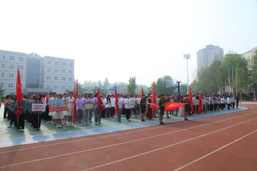 上午8时,运动会在激昂的《运动员进行曲》中拉开帷幕。校国旗队、校旗队、九个二级学院学生方队和十五个教工方队精神抖擞步入会场。