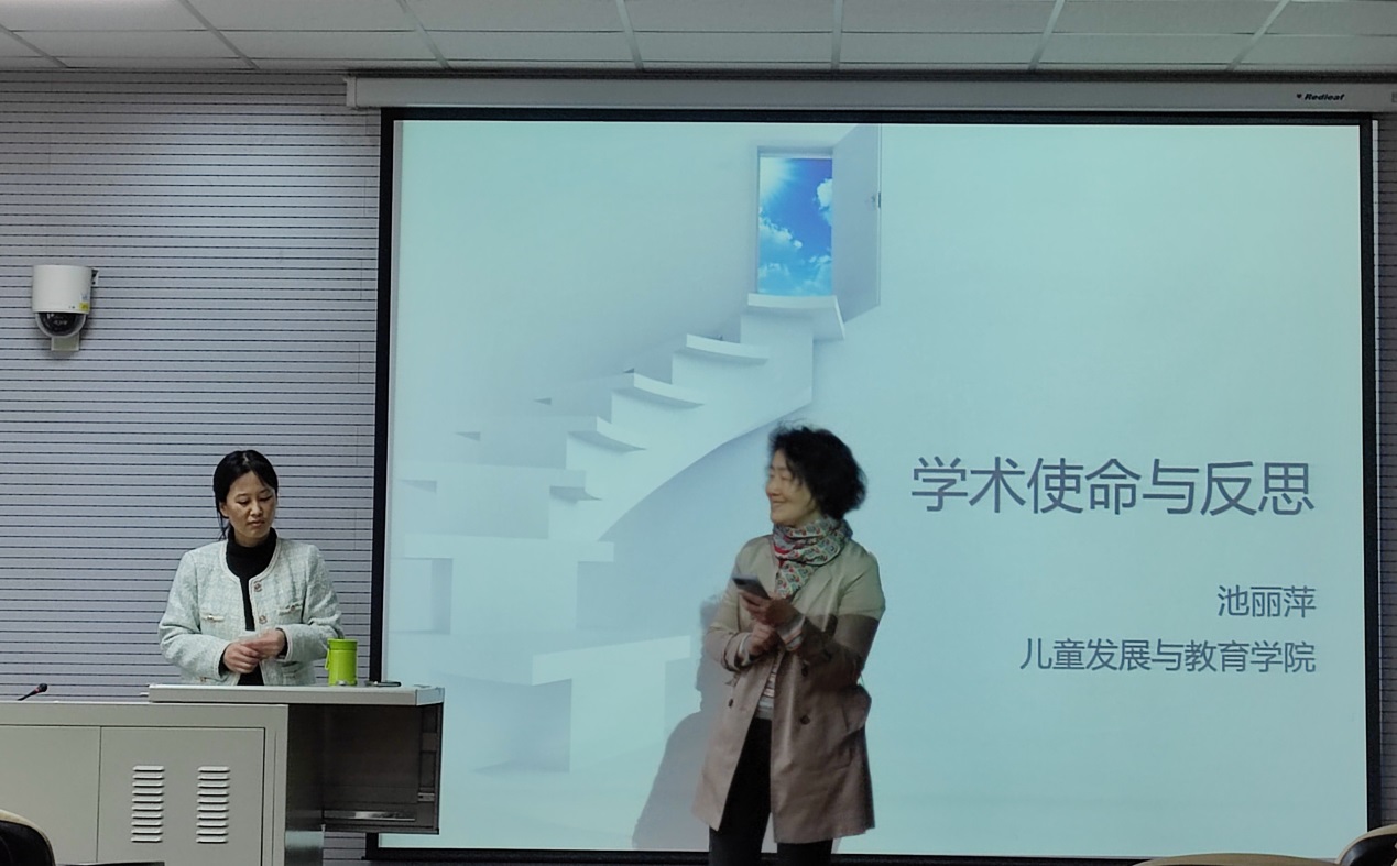 为深入贯彻落实习近平新时代中国特色社会主义思想和党的二十大精神,切实加强教师间的学术交流与合作,营造良好学术氛围,实现科研育人目的,增强教师队伍综合素质,4月4日下午13:00,儿童发展与教育学院开展了第五期学术工作坊“学术使命与反思”。本次学术工作坊的主讲人是应用心理学专业的池丽萍教授,主持人是应用心理学专业的夏菡副教授,儿童发展与教育学院院长陈辉、党总支书记郑雷及全体教职员工参加了本次学术工作坊。