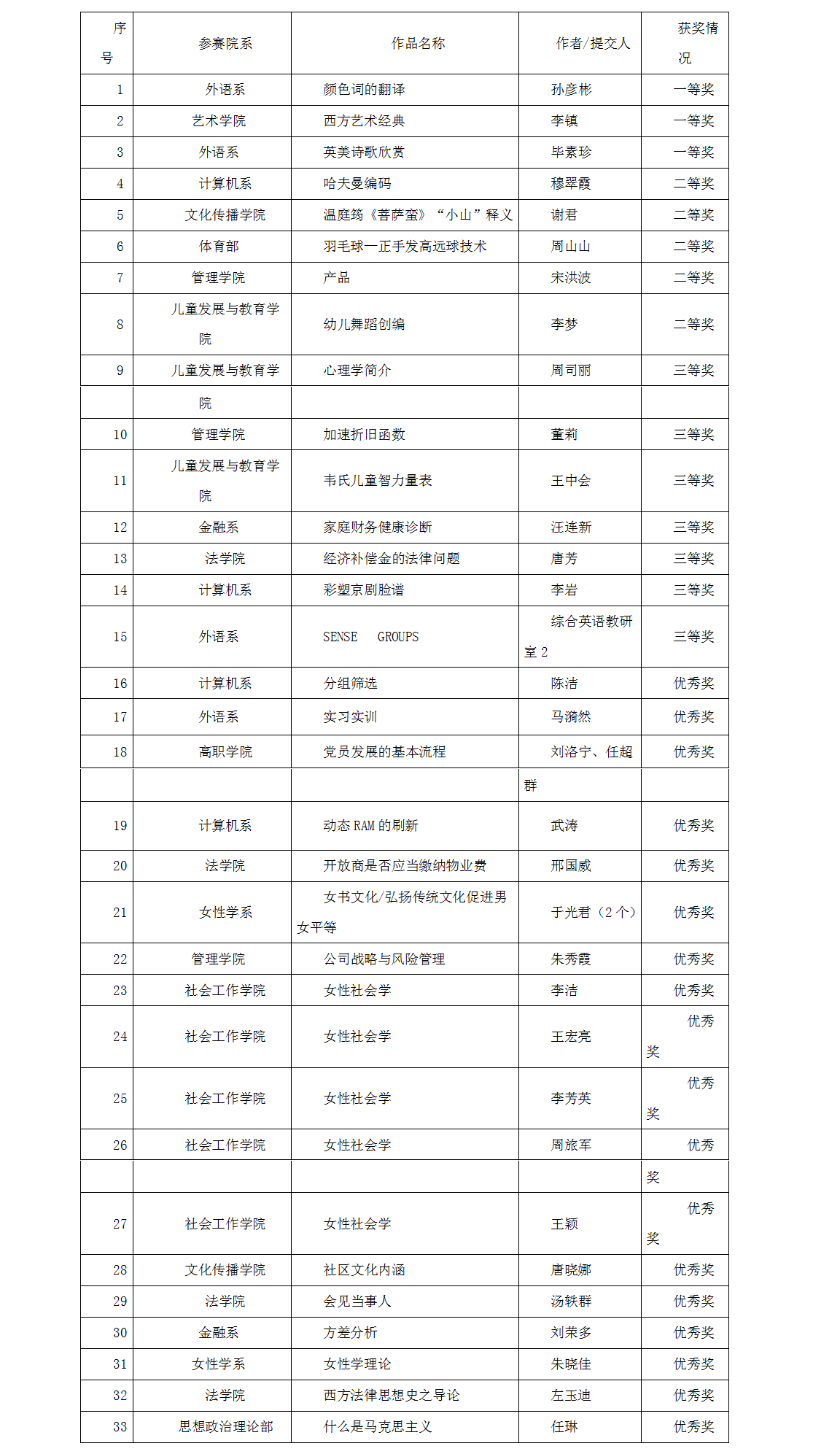 中华女子学院第一届微课设计大赛获奖情况一览表