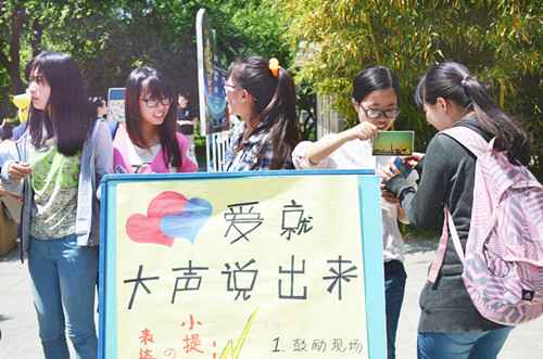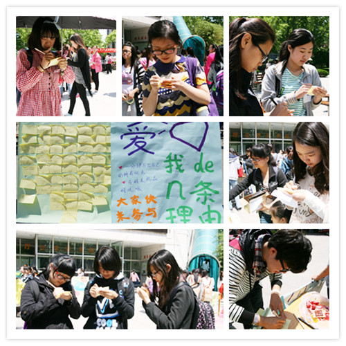 开幕式上,围绕“孝亲、爱友、尊师、自爱”这四个大学生应有的品质,我们展开了“爱就说出来”、“闺蜜瞬间”、“我和老师的故事”和“爱我的N条理由”四个版块的活动。其中,“爱就说出来”鼓励学生通过各种方式向父母说出感恩之爱意,我们为大家提供的感恩明信片也全部写上了同学们真挚的话语,预备寄往各人家中。“闺蜜瞬间”则留下了20余张闺蜜照,也有一些害羞的同学婉拒拍照,但留下了有爱的话语;“我和老师的故事”是在微博平台上倡导大家回顾师恩的有奖活动;“爱我的N条理由”则吸引了许多同学前来写出自己的优点,在这一过程中更加肯定自己。