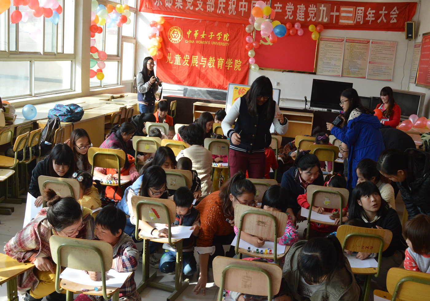 儿童发展与教育学院学生党员以学前教育和应用心理专业为依托,充分发挥我院学生的学科专业优势,结合东邵渠村的实际情况,开展了歌舞表演、游戏、绘画比赛等3个环节在内的亲子游戏,通过“我是诚实的小孩”、“袋鼠妈妈和小袋鼠”、“咸蛋超人”、“气球快跑”等亲子合作、亲子创意活动,学生党员们带领村民和孩子们度过了一段温馨又快乐的亲子时光。