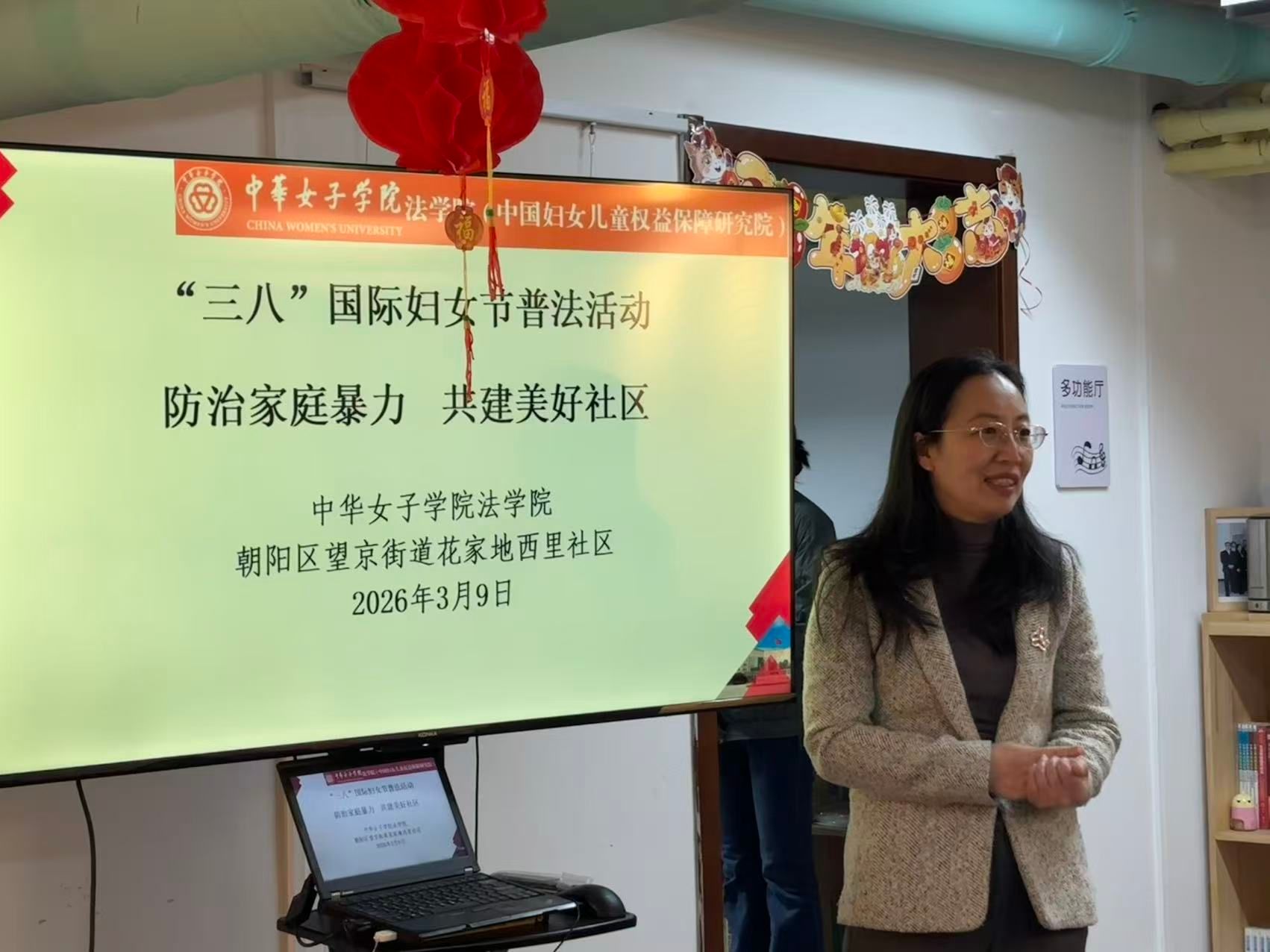 在第116个“三八”国际妇女节到来之际,为全面贯彻落实党的二十届四中全会精神,深入践行习近平总书记关于妇女儿童和妇联工作的重要论述,3月9日上午,法学院在朝阳区望京街道花家地西里社区综合活动室成功举办了以 “防治家庭暴力 共建美好社区”为主题的普法宣传活动。法学院党总支书记邢红枚副教授带领法学院24级部分硕士研究生为花家地西里社区居民送上了一份实用的 “法律礼物”,取得了良好的社会效果。