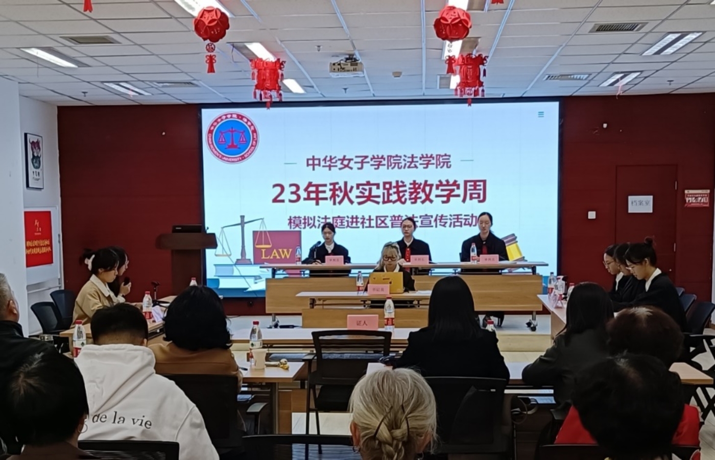 11月3日上午,法学院走进太阳宫惠忠庵社区,举办了一场别开生面的秋季实践教学周普法活动,在生动传播法律知识的同时,推动和谐社区建设。本次普法活动由太阳宫地区办事处,中华女子学院法学院、北京市泽元律师事务所共同举办,分为普法海报设计比赛和模拟法庭两部分。走进社区前,法学院举办了普法海报设计大赛,学生们围绕漏水纠纷这一主题,设计出了数十幅具有创意的法治宣传教育海报。模拟法庭环节中,法学院的学生们模拟审理了一起源于现实的漏水纠纷案件,充分展示了庭审活动的严肃性和权威性,还原了法庭程序,让社区居民们对法律程序有了更直观的了解。通过本次社区普法活动,学生们得以将理论知识应用于实际场景,也提高了学生解决实际问题的能力。