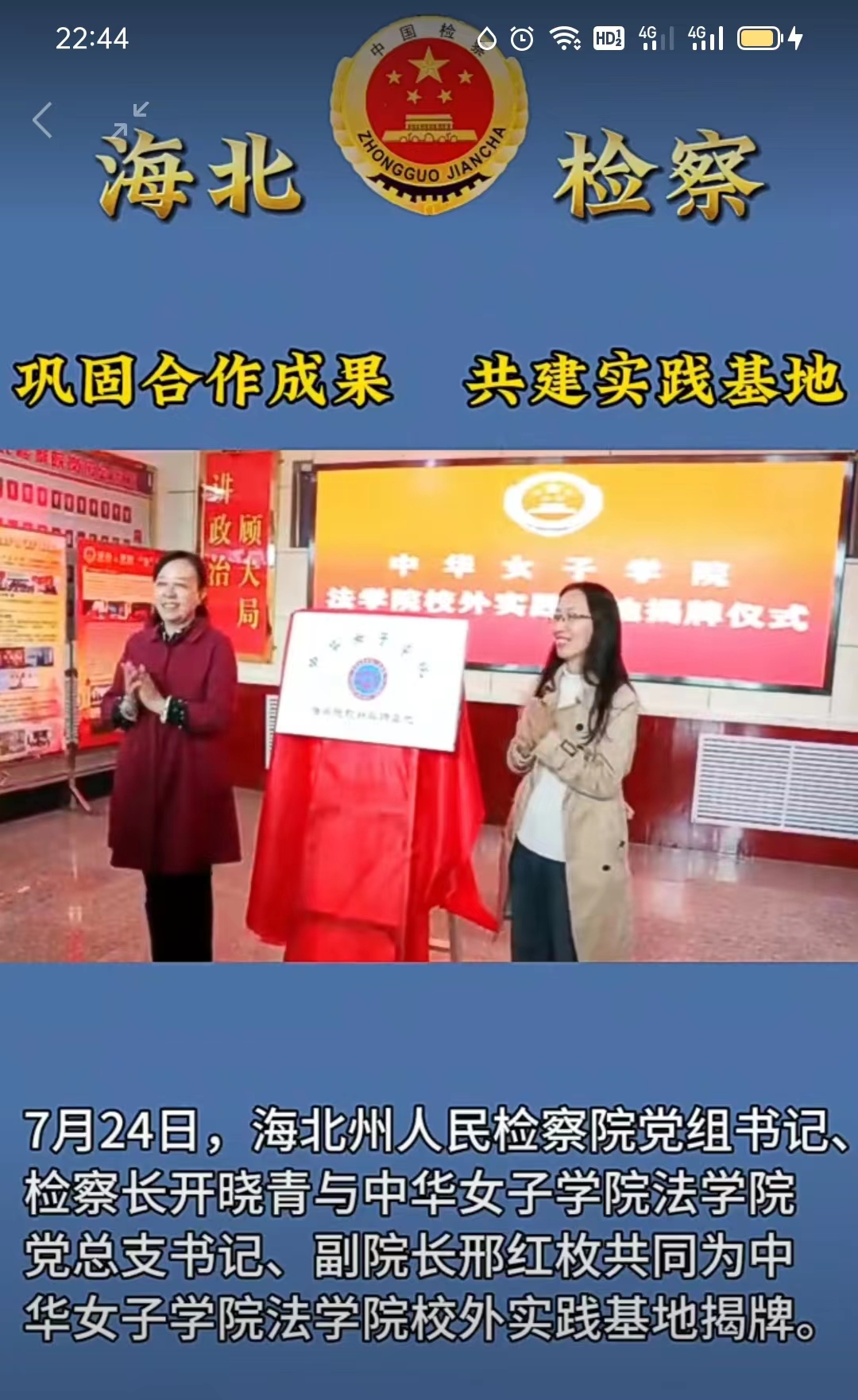 7月24日下午,调研组一行到达海北藏族自治州人民检察院。检察院党组书记、检察长开晓青与法学院党总支书记兼副院长邢红枚共同举行了中华女子学院法学院校外实践基地揭牌仪式。随后调研组与海北州检察院的相关人员进行了座谈交流,海北州检察院第一检察部负责人王韶山介绍了海北州未成年人保护的总体情况,双方对海北州未成年人检察工作社会支持体系建设的经验和困境进行了深入探讨。海北州人民检察院党组成员、副检察长易钧、政治部主任宏选等参加座谈。邢红枚衷心感谢海北州人民检察院对调研组一行热情周到的安排。希望此次调研能够促进中西部地区未成年人保护工作的交流以及理论与实务界的互动,为海北州未成年人保护工作提供有益的指导帮助。