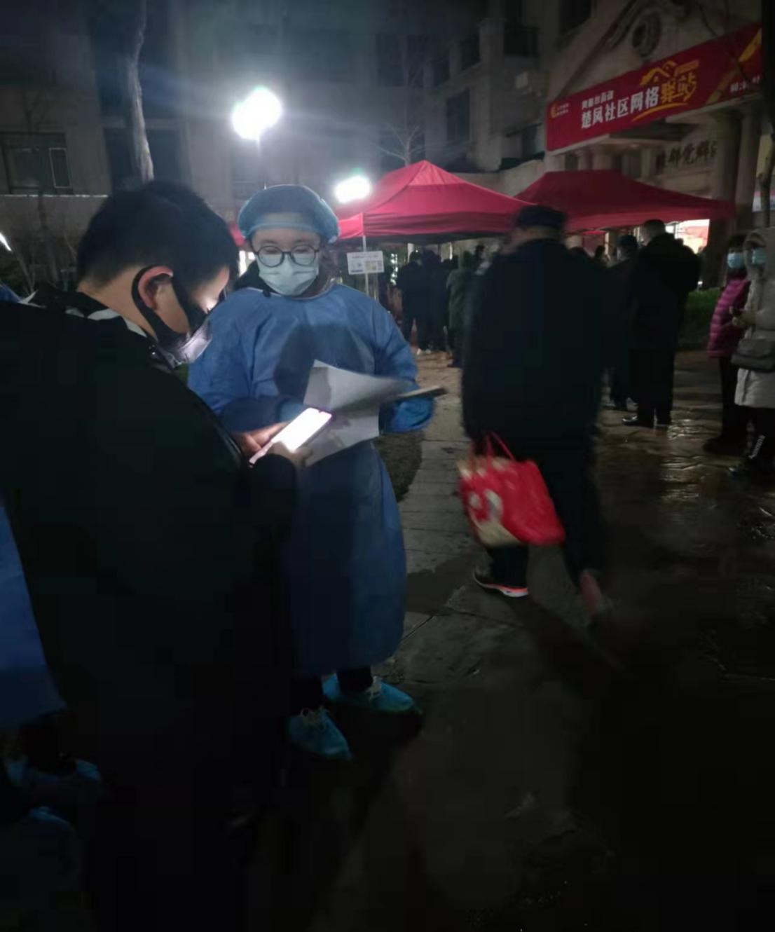 我院2019级来自河南信阳的蔡子宜同学主动申请,积极参与社区疫情防控志愿活动,在防疫点登记排查进出人员、测量体温、协查信息、卫生消毒、维持现场秩序等。由于社区居民量较多,每日检测人数达上千人,而志愿者却严重不足,蔡子宜同学常常在寒冷的室外一站就是一整天,这让她深刻地感受到了防疫工作者的艰辛与不易。