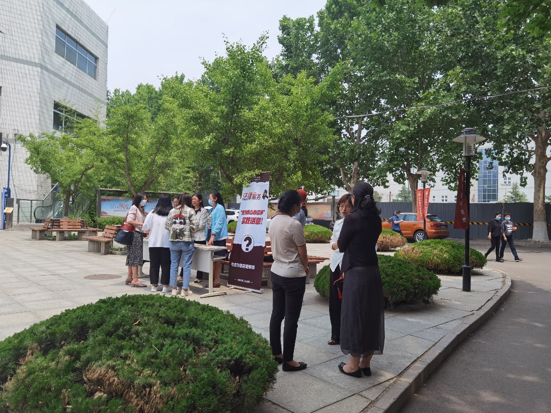 为深入学习贯彻习近平总书记在党史学习教育动员大会上的重要讲话精神,认真贯彻落实中央党史学习教育领导小组印发《关于< “我为群众办实事”实践活动工作方案>的通知》,贯彻落实习近平法治思想,推进党建与业务深度融合,把学习党史同总结经验、观照现实、推动工作结合起来,弘扬党的光荣传统、优良作风,践行党的初心使命、根本宗旨,强化公仆意识、为民情怀,充分发挥基层党组织的战斗堡垒作用、党员先锋模范作用和党员领导干部表率作用。法学院教工党支部组织法学院全体教师在2021年6月8日中午在学生食堂前小广场为全校师生开展法律咨询活动,活动历时一个半小时。