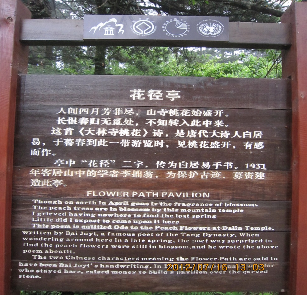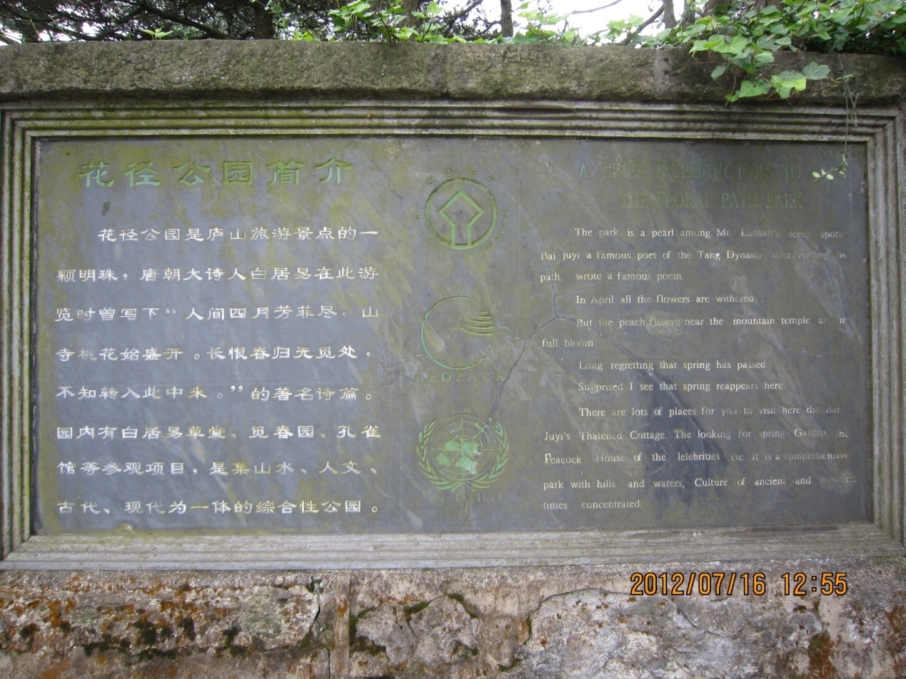 庐山集历史名山、政治名山、文化名山于一身,出现过大量的历史事件、历史人物、文学作品等,具有明显的文化特征。以文学作品为例,著名景点“花径”留下了白居易的《花径亭》诗篇,诗文如下:
