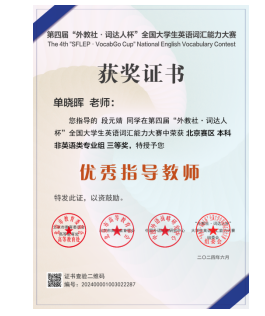 近日,第四届“外教社·词达人杯”全国大学生英语词汇能力大赛落下帷幕,100余名女院学生参加比赛,33名同学在校赛中获奖,2021级学前教育顾宸语获得“北京赛区 本科非英语类专业组二等奖”,2021级汉语国际教育段元婧获得三等奖。