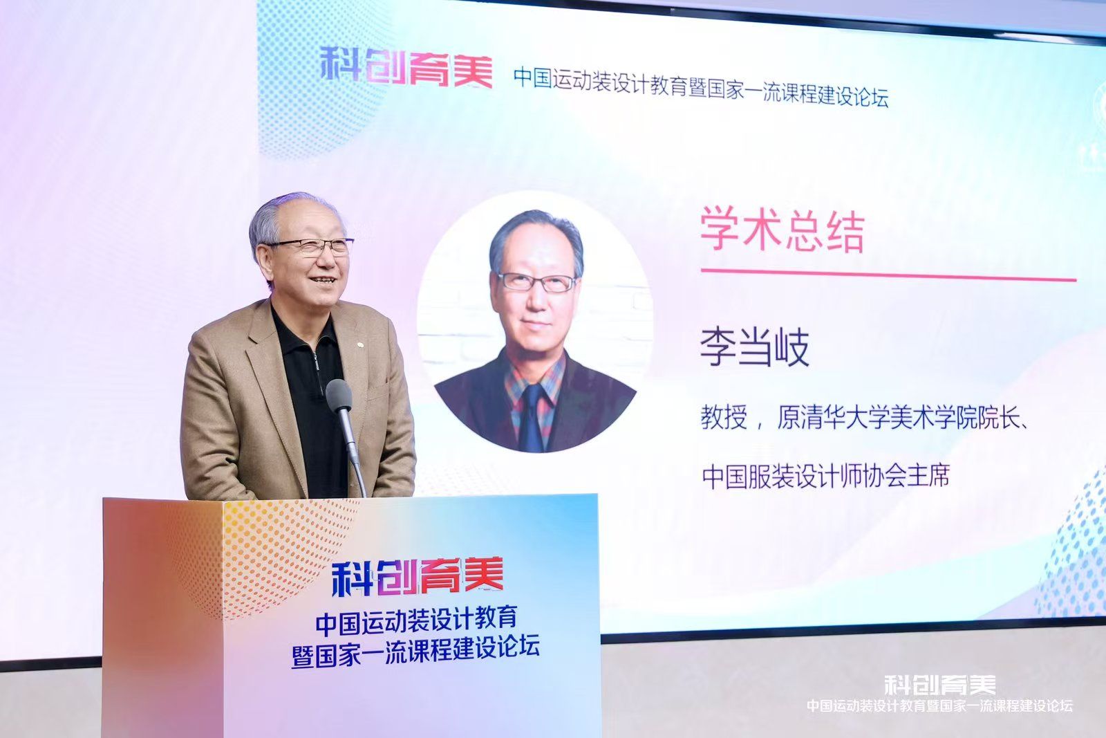 李当岐教授作为特邀学术总结嘉宾,回顾点评专家主旨发言。他指出本次论坛延续深化中国国际大学生时装周初衷,为设计教育者搭建宝贵交流平台,高度赞赏各校一流课程建设的教学理念与实践成果。他特别肯定中华女子学院服设专业聚焦功能设计、深耕不辍,核心课程2003年至今“挖深坑、见真水”,获国家一流课程认定实至名归,同时认可北服、武纺等校特色成果。结合赛事评委经历,他指出部分赛事重创意轻实用的问题,强调“设计的核心是实用”,呼吁教育摒弃虚浮,立足市场需求与实际条件,真刀真枪培养“有用的服装设计人才”。