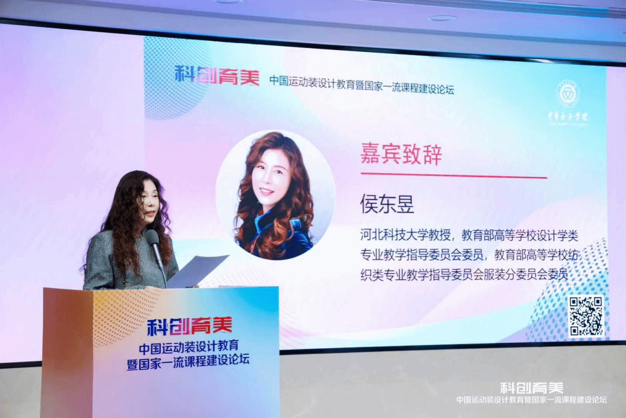 侯东昱教授致辞时肯定中华女子学院服设专业丰硕成果包括核心课程获评国家一流,教材与设计赛事获奖,在全球妇女峰会上的独特作用尤为亮眼。她强调,运动装设计已融合科技、美学、健康与可持续伦理,产业变革为设计教育提新要求。“科创育美”理念促跨学科融合,衔接教育创新与产业升级。她期待论坛深化产学研交流,推动智能科技、新材料与人文设计结合,构建开放协同的教育生态,在可持续与包容性设计领域彰显中国设计责任与声音。
