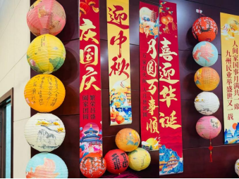 舞会现场精心布置,中国风纹样灯笼点缀其间,国庆元素贴纸与中秋玉兔、圆月装饰相映,处处洋溢着温馨喜庆的双节氛围,同学们纷纷驻足留影,用镜头定格这份美好的双节记忆。