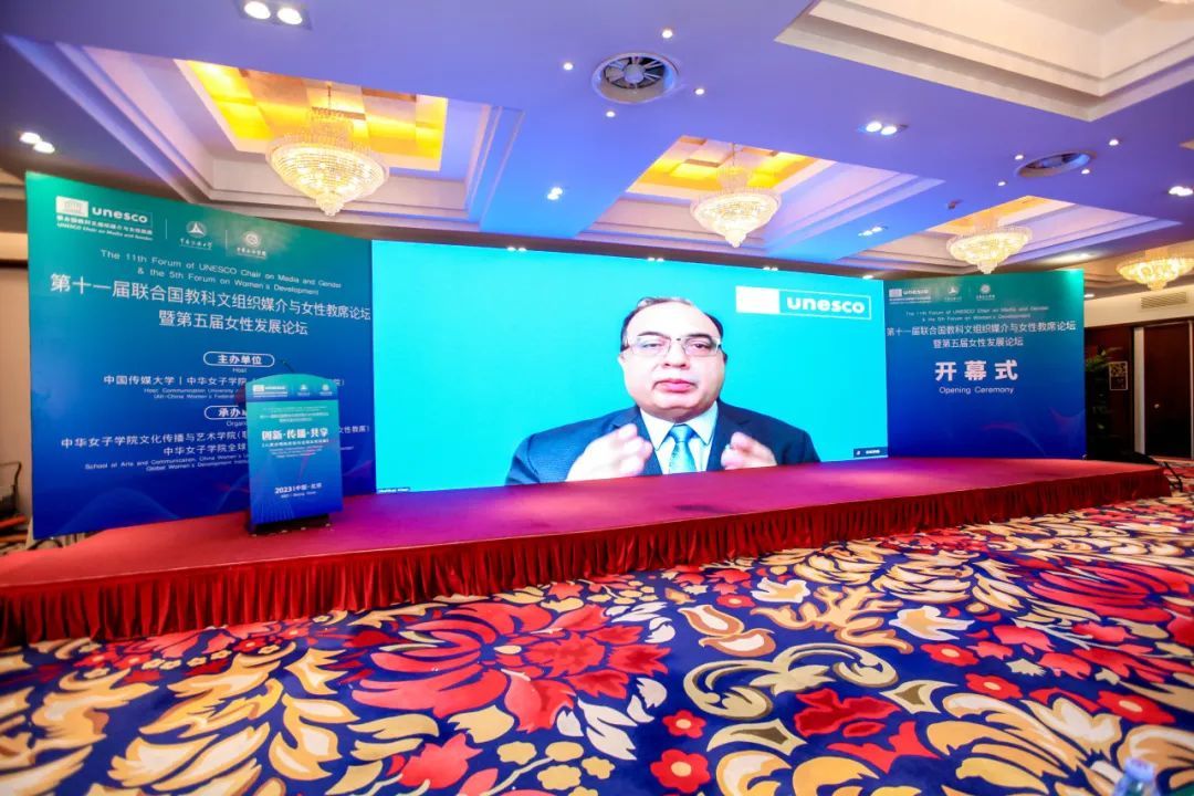 联合国教科文组织驻华代表处主任夏泽翰(Shahbaz Khan)在视频致辞中首先对会议的主办方中国传媒大学和中华女子学院表示衷心的祝贺,并对主办方组织这场盛会所付出的辛勤努力表示感谢。他指出,本次论坛的主题与联合国教科文组织的使命紧密契合,即借助媒体以及信息传播的手段,建设包容的知识社会,为女性赋能。论坛召集来自学术界、民间社会、政府和媒体从业者,分享与促进性别平等,挑战陈规定型观念,确保妇女真正接触媒体、发表意见,参与媒体相关的研究和实践。他强调,我们需要利用数字机遇来推进这一目标,加快其在性别平等方面的进展,抵制现有的歧视、刻板印象和压迫模式。