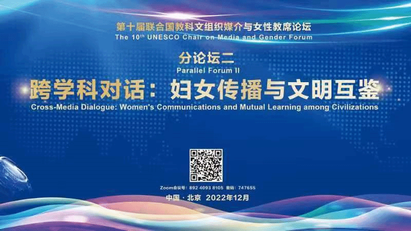 为了贯彻习近平总书记关于“加强国际传播能力建设,全面提升国际传播效能,形成同我国综合国力和国际地位相匹配的国际话语权”的精神,积极讲好中国故事,面向世界讲好中国式现代化中国妇女发展故事,彰显女性力量,在推动文明交流互鉴,构建人类命运共同体中贡献强大力量,2022年12月28日在中华女子学院(全国妇联干部培训学院)线上成功举办第十届联合国教科文组织媒介与女性教席论坛。本届论坛的主题是“妇女国际传播与人类命运共同体构建”。本次平行论坛围绕“跨学科对话:妇女传播与文明互鉴”议题,深入探讨妇女国际传播在促进女性发展和社会进步、文明互鉴和人类命运共同体构建的作用,为中国式现代化建设作出更大贡献。本次平行论坛由《中华女子学院学报》主编、教授石彤进行主持与点评,邀请了八位来自不同职业、不同学校的嘉宾围绕着妇女传播,从不同的学科角度进行探讨。