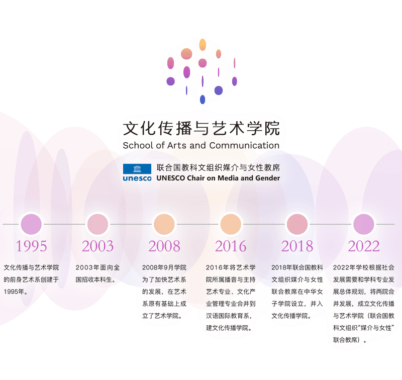 文化传播与艺术学院(联合国教科文组织媒介与女性教席)的前身艺术系创建于1995年,2003年面向全国招收本科生,2008年9月学院为了加快艺术系的发展,在艺术系原有基础上成立了艺术学院。2016年将艺术学院所属播音与主持艺术专业、文化产业管理专业合并到汉语国际教育系,建文化传播学院。2018年联合国教科文组织媒介与女性联合教席在中华女子学院设立,并入文化传播学院。2022年学校根据社会发展需要和学科专业发展总体规划,将两院合并发展,成立文化传播与艺术学院(联合国教科文组织“媒介与女性”联合教席)。现有服装与服饰设计专业、播音与主持艺术专业、视觉传达设计专业、网络与新媒体专业、表演(服装表演)专业五个普高本科专业。其中服装与服饰设计与播音与主持艺术专业为国家级一流本科专业建设点。