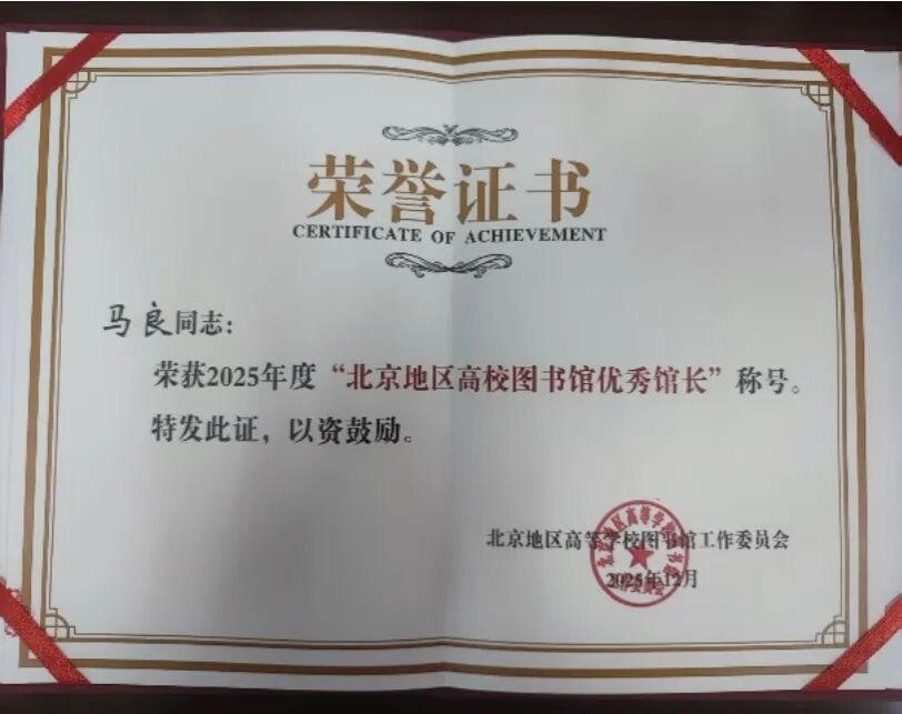 12月18日,在由中国人民大学承办的“智慧赋能·融合创新——2025年北京高校图书馆馆长论坛暨BALIS工作总结会”上,北京地区高等学校图书馆工作委员会公布了年度评优结果,马良馆长荣获“2025年北京地区高校图书馆优秀馆长”称号。