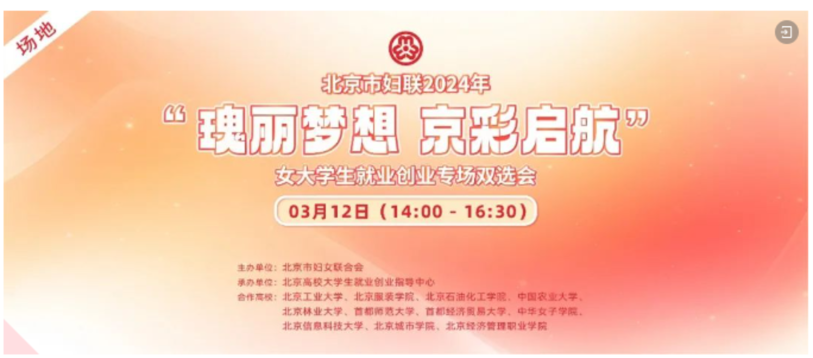 3月12日,与北京市妇联、北京市就业创业指导中心及其他高校联合举办2024年“瑰丽梦想 京彩启航”女大学生就业创业专场双选会将送来又一波高质量的就业岗位。