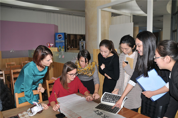 2015年10月14日上午,来自意大利帕维亚大学的优秀女大学生和我校学生代表在“水语咖啡”创意实践基地举行校际学生交流。
