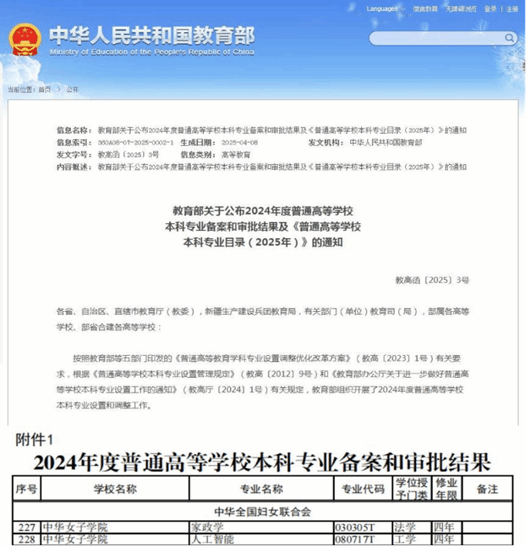 近日,教育部印发《关于公布2024年度普通高等学校本科专业备案和审批结果的通知》(教高函〔20253),我校申报的家政学专业、人工智能专业均成功获批。截至目前,我校本科专业总数达到20个,涵盖法学、教育学、管理学、经济学、文学、艺术学、工学7个学科门类。