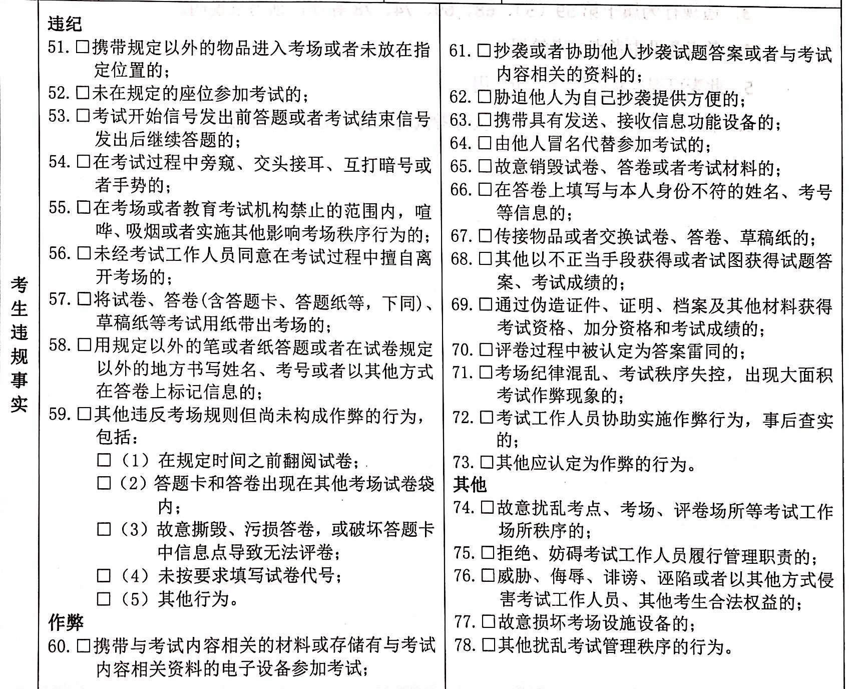 4、考生如已将违规物品带入考场,必须将物品放置存包处,其中手机应处于关闭状态,不得随身携带,否则按违规处理。