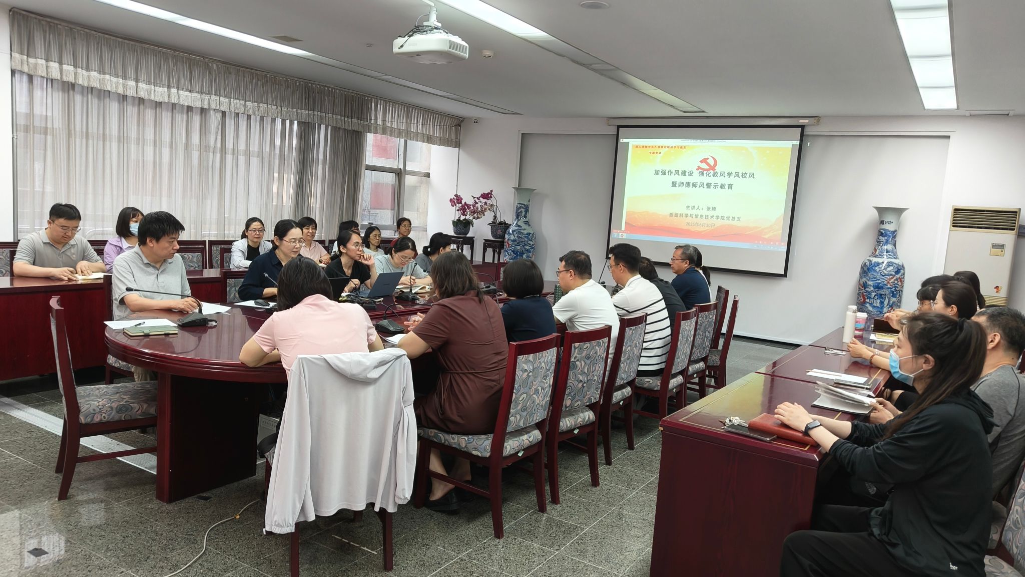 2025年6月30日,数据科学与信息技术学院召开“加强作风建设 强化教风学风校风”专题会议暨师德师风警示教育党课。学院党总支书记张绮以深入贯彻落实中央八项规定精神为核心,围绕《新时代高校教师职业行为十项准则》,结合女院教育特色,为全院教职工上了一堂兼具理论深度与实践指导意义的专题党课,推动作风建设与师德师风建设的深度融合。