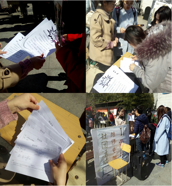 此次自发组织开展的志愿服务活动,同学们积极响应,不但践行了“雷锋精神,崇尚奉献”的口号,更加体现了女大学生自强独立的风采,此次活动时间从3月1-3月7日。活动现场,有的同学负责发宣传单,有的同学负责现场答疑解惑,有的同学则负责记录着需要维修的人员名单和联系方式。每位志愿者都很耐心的为前来咨询的师生们进行讲解,从简单的开关机安全到复杂的系统重装,志愿者们乐此不疲,激情洋溢。整场活动持续了近两个小时,除了现场解决了师生们大量的电脑问题,还接到预约维修单50余份,维修小组成员们会利用课余时间进行免费维修。