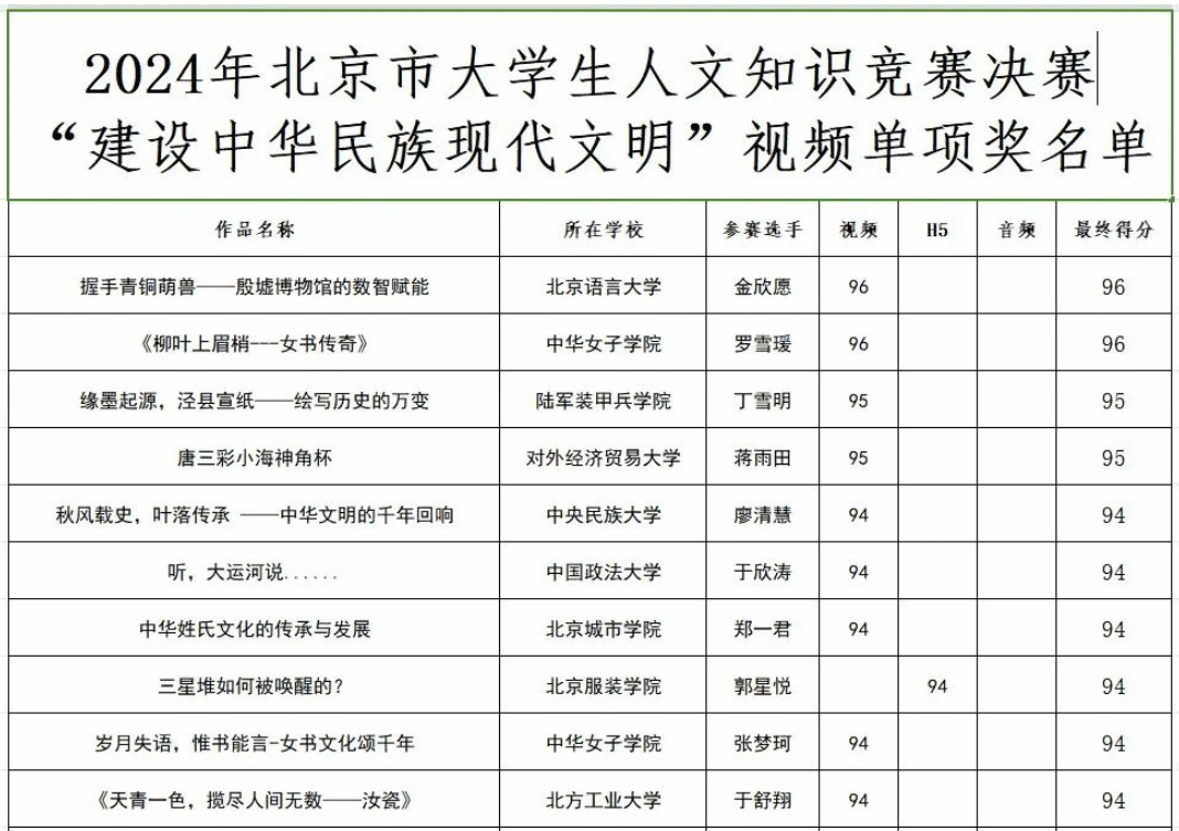 日前,北京市大学生人文知识竞赛组委会公布了2024年北京市大学生人文知识竞赛个人赛决赛综合成绩评奖名单和2024年北京市大学生人文知识竞赛个人赛“古诗创作”及“建设中华民族现代文明”视频单项奖名单,来自我校国际教育学院、管理学院、儿童发展与教育学院、妇女发展学院、法学院、社会工作学院等院系的14人次获得北京市人文知识竞赛的一、二、三等奖及视频单项奖。这些喜人成绩不仅展示了女院学子的人文素养与精神面貌,同时也彰显了学校在立德树人、人文教育方面的实践成果。