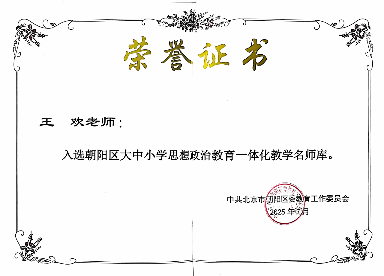 近日,朝阳区教育工作委员会公布大中小学思想政治教育一体化教学名师库入选名单,马克思主义学院院长王欢教授成功入选。这是对我校思政课教育教学改革的肯定,更是对我校推进大中小学思想政治教育一体化工作的肯定。未来,马克思主义学院将持续推进该项工作,努力取得新的突破。