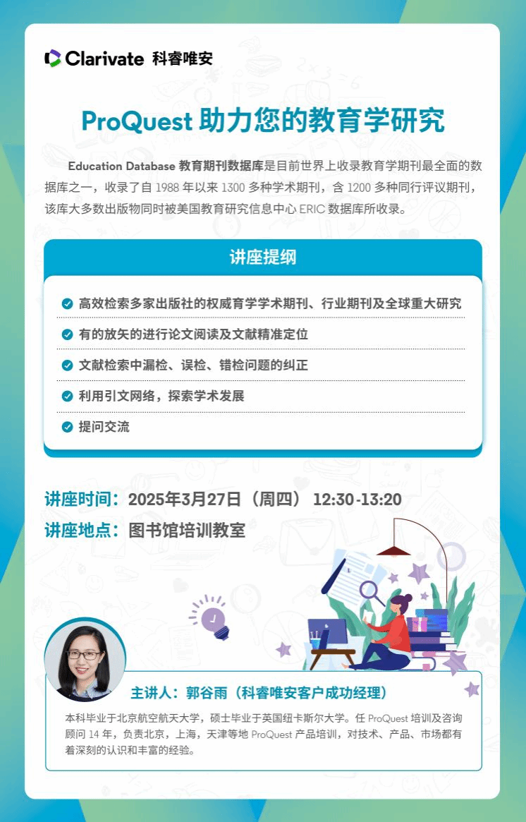 为助力大家精准获取全球教育资源、提升学术研究效率,图书馆“一小时讲座”特邀ProQuest Education Database教育期刊数据库培训师来校开展专题培训。ProQuest Education Database教育期刊数据库是目前世界上收录教育学期刊最全面的数据库之一。无论是论文写作、课题研究,还是探索学科前沿,这场干货满满的讲座都能为你提供超实用技巧!