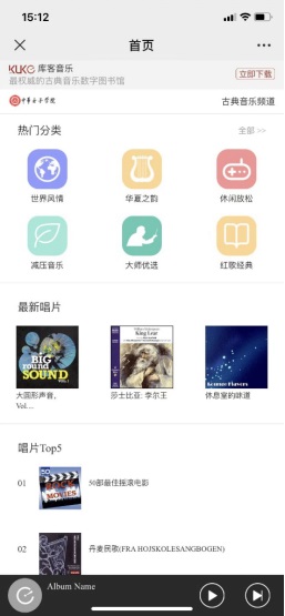 库客微乐是库客音乐为图书馆公众号打造的音乐欣赏平台,提供红歌经典、爱上古典、格调爵士、古典跨界、影视原声、浪漫金曲、英语经典、世界风情、华夏之韵、休闲放松、减压音乐、大师优选等12个类别的音乐,700余张专辑。
