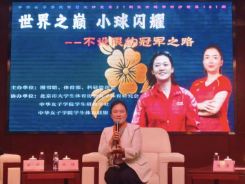 3月30日下午,中华女子学院育慧大讲堂第21期暨女院学术沙龙第101期,荣幸邀请到两位全国三八红旗手:曾先后7次获得乒乓球混双世界冠军、入选国际乒联名人堂的北京大学刘伟教授和2024年巴黎奥运会羽毛球女双冠军、北京体育大学研究生陈清晨,与女院师生共聚一堂,围绕“世界之巅 小球闪耀——不设限的冠军之路”展开一场关于冠军精神、女性成长与人生选择的深度对话。本次活动由图书馆、体育部和科研管理处联合主办,北京市大学生体育协会女子体育研究会、中华女子学院学生研读学社和学生体育联盟协办。中华女子学院副院长李莹、首开书院负责人吴超、图书馆馆长马良、体育部部长丁占罡、科研管理处副处长叶亮以及百余名师生共同参与,本次活动由图书馆副馆长吴倩主持。