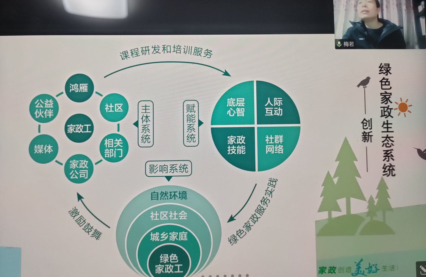 本次讲座的主题为“绿色家政工实践分享”。梅若老师首先介绍了机构创立与发展过程、服务逻辑与工作策略和主要项目,重点讨论了绿色家政创新构想的提出与实践,探讨了当前绿色家政所面临的社会问题和发展现状。