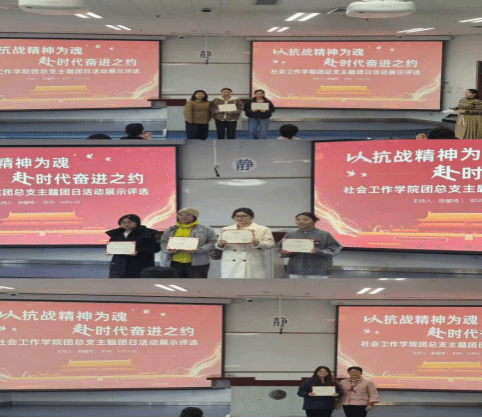 展示评比现场,各班团支部用创意与行动汇报了形式新颖多样、内容丰富多彩的团日活动,成果精彩呈现:2025级社会工作妇女服务团支部全体同学进行了《烽火巾帼志,青春接力行》主题诗朗诵,2024级社会工作2班团支部带来《红烛照血,青史承魂》主题集体朗诵,2024级社会学1班团支部推出《数字人穿越对话》创意展示,23级、24级的团支部通过主题宣讲、特色作品展演等方式,生动诠释抗战精神内涵,充分展现支部协作力与青年创意。