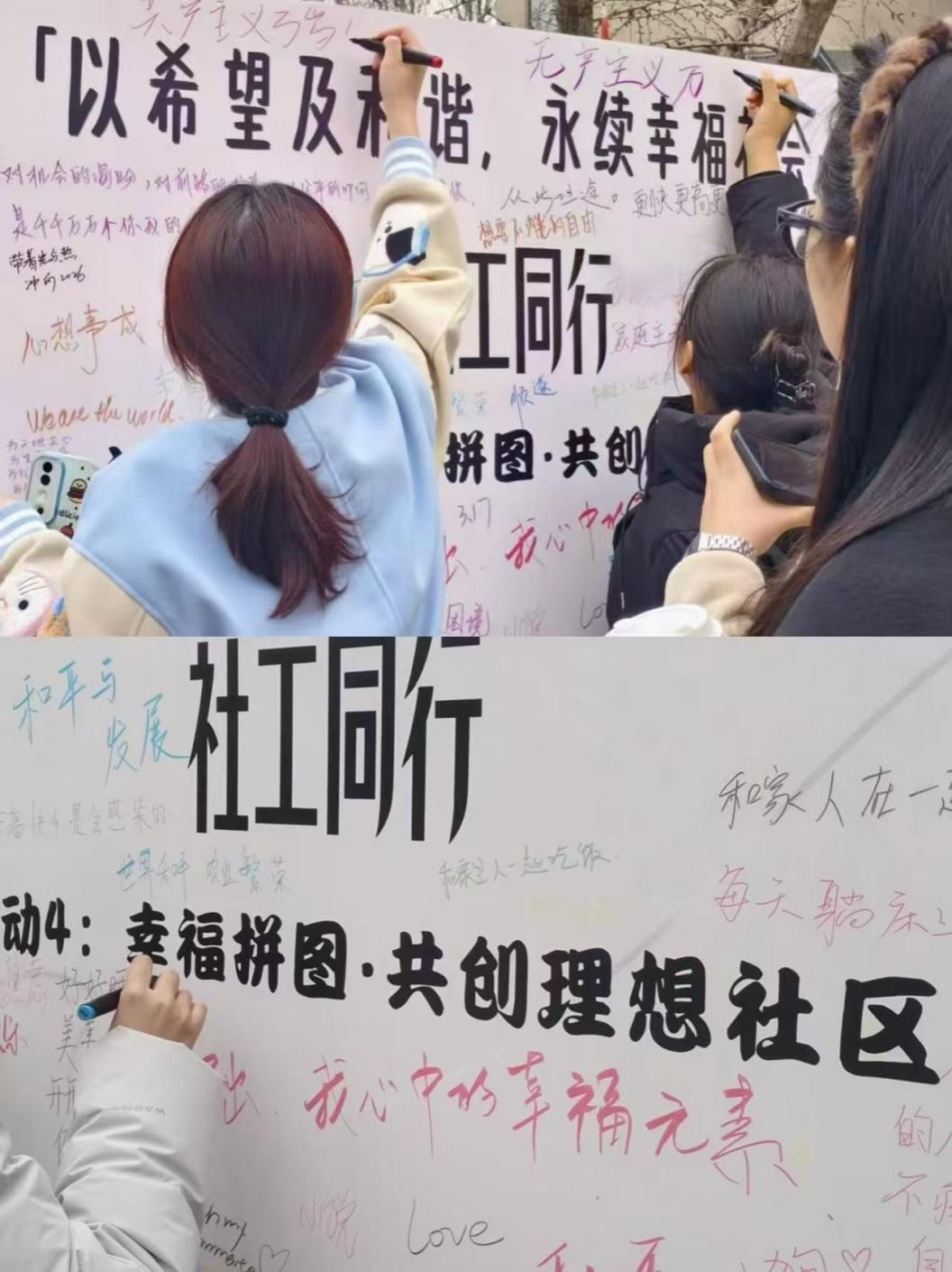 现场摆放设计为“理想社区”轮廓的大型空白展板,同学们可通过参与社工知识小游戏获得彩色拼图贴纸,也可直接用画笔在展板上标注“我心中的幸福元素”,从心理健康站、共享空间到社区互助角,大家各抒己见,在展板上勾勒心中的幸福社区模样,最终共同完成一幅生动的“幸福社区蓝图”,让“永续幸福社会”的理念以视觉化的形式呈现。