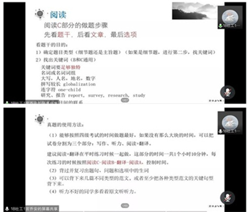 之后由18级社工一班的万可欣同学通过备考误区、备考方式、答题技巧及其他注意事项四个部分展开介绍。重点强调了刷真题对四级考试的重要意义,并就此分享了如何高效刷题的方法,同时还以六级为例介绍了自己对于听力、选词填空、阅读理解、翻译及作文部分的答题技巧,有效地帮助了同学们做好考试准备。
