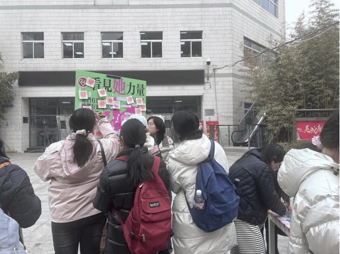 3月7日中午,食堂小广场化身“她力量能量站”。刻板印象KT板“成为焦点”“女性要柔弱一点”“女生多的地方是非多”“文科优势”等标签被参与者逐一撕下,替换为“独一无二”“自信”“做自己”等铿锵宣言。活动现场,社会工作学院特别定制的"女性力量钥匙扣"作为勇气见证,被赠予每位参与活动的学子。