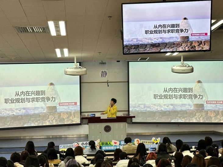 其次,职业规划专题分享会环节。刘治敏老师通过十年个案辅导的经验,深入剖析了年轻人职业发展的困境,并结合市场情况,引导同学们认识内在职业兴趣。她通过快问快答、性格测试等方式,帮助同学们进行自我认知,并规划职业方向。刘老师详细讲解了霍兰德兴趣测试的六大维度,并组织大家进行测试,根据得分情况进行解读,结合名人、学科对不同维度的性格特质进行深入讲解。在“内在兴趣在规划、求职中的应用”环节,刘老师明确了职业规划的定义与规划职业生涯的方式,强调了职业诉求与职业规划的区别,并指导同学们如何运用霍兰德测试结果帮助自己确定职业规划目标。
