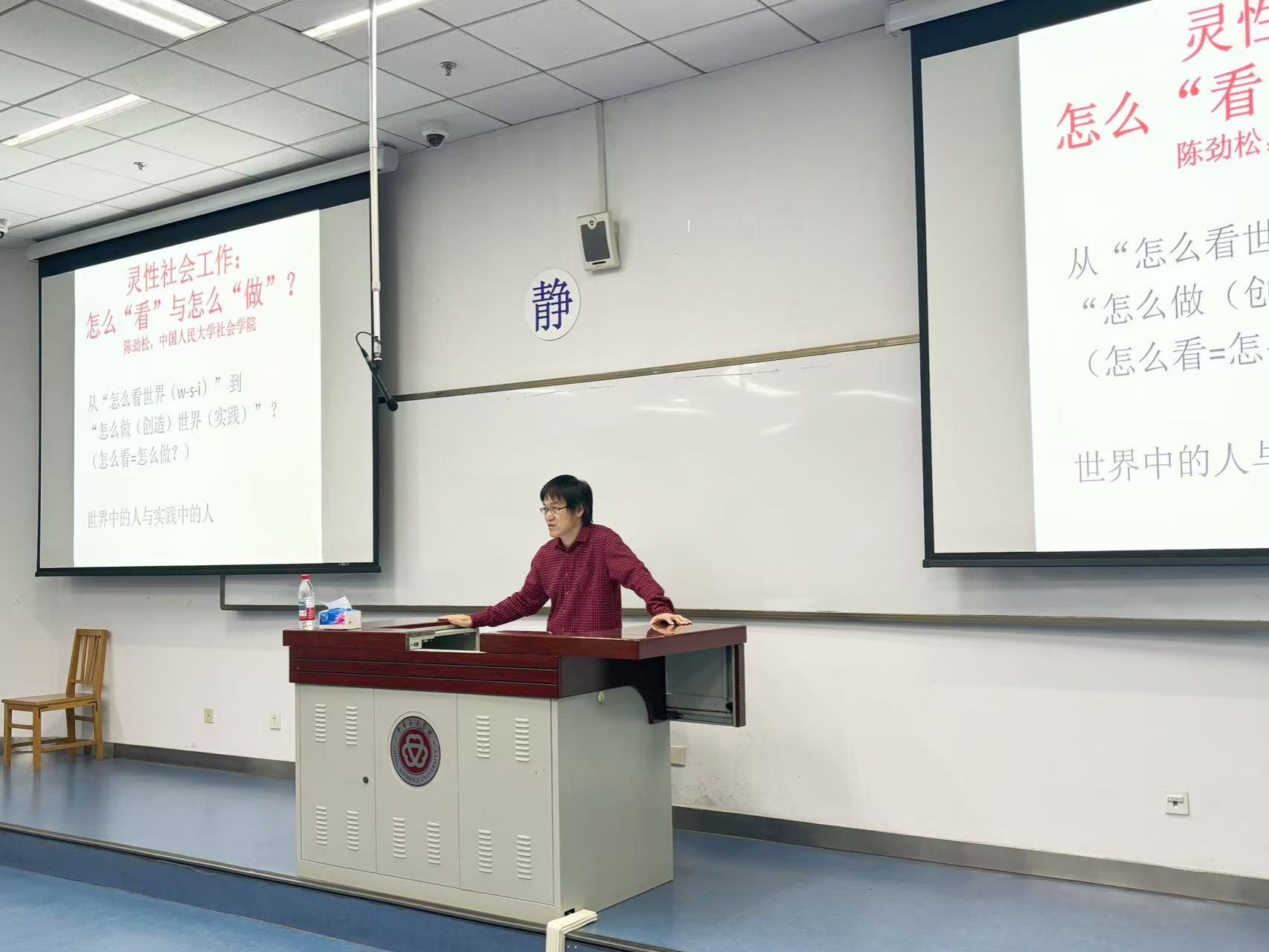 郝彩虹首先代表学院对陈劲松教授的到来表示热烈欢迎。她指出,陈教授长期深耕社会工作本土化与灵性社会工作研究,其学术洞见与实践经验对拓展师生的理论视野具有重要意义。她鼓励同学们珍惜此次学习机会,深入体会灵性社会工作的学理内涵与现实价值。