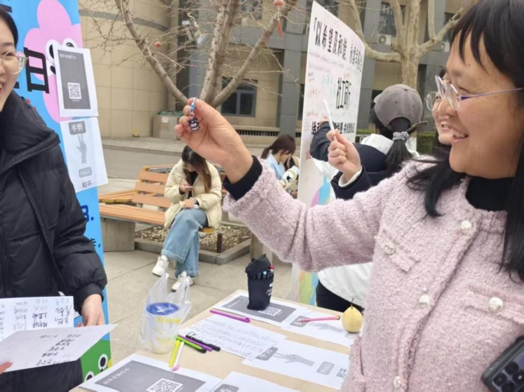 现场设立和平手势主题打卡点,打造醒目的和平手势背景板,师生路过可自由停留,比出和平手势拍照打卡,现场张贴小程序二维码,参与者可自愿上传打卡照片。一个简单的手势,成为校园里的友好暗号,让陌生的师生因共同的行动产生联结,凝聚起共建和谐校园的微小力量。