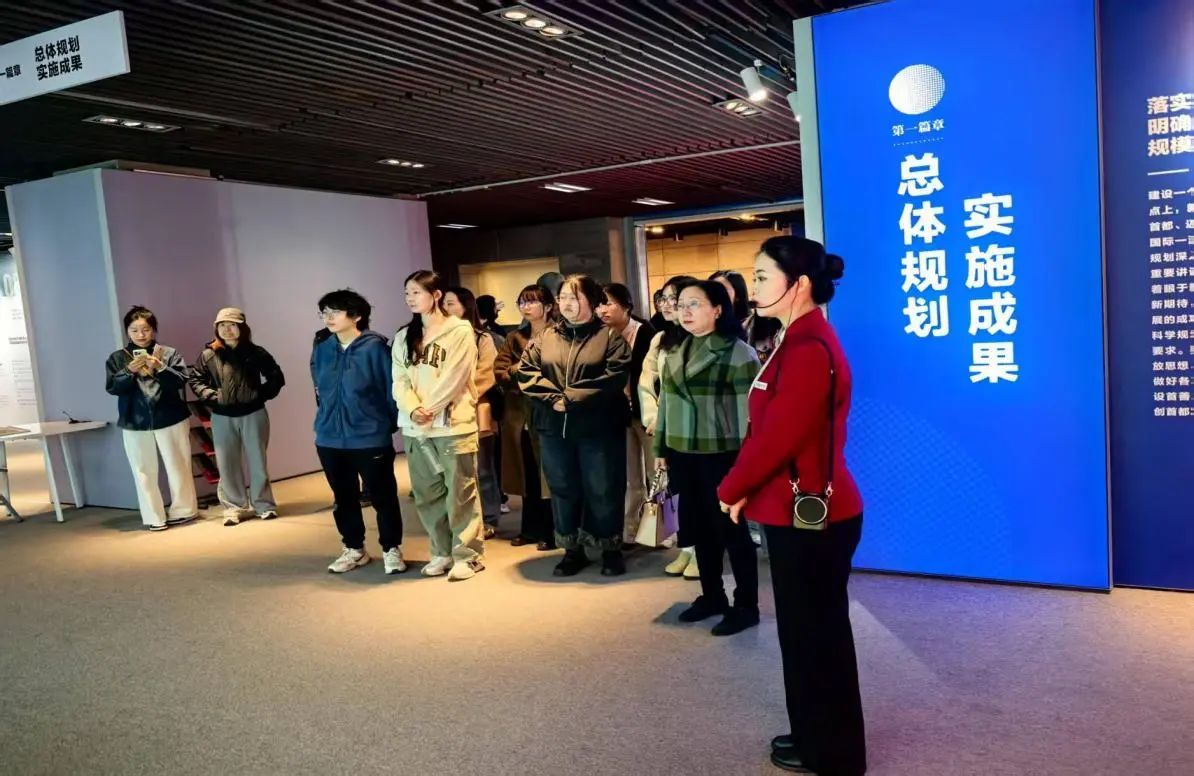 随后,同学们步入《北京城市总体规划(2016-2035 年)实施成果展》展厅,深入领略作为中华民族伟大复兴大国首都的北京,在规划与建设进程中取得的卓越成就。该展览围绕落实首都城市战略定位,精心设置发展目标、规模把控、空间布局等多个板块,系统而全面地回应了“建设一个什么样的首都”这一时代命题。