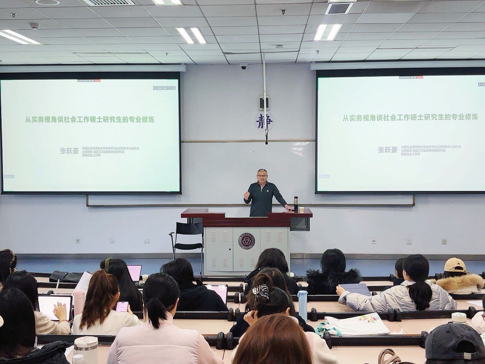 2025年11月18日下午,由中华女子学院社会工作学院与科研处联合主办的“‘育慧大讲堂’第十九期暨社会工作学院‘智行讲堂’第二十七讲”在教图楼210教室举行。本讲特邀立德智库˙基层工作品牌研究院研究员、高级社会工作师张跃豪老师作专题报告,主题为《从实务视角谈社会工作硕士研究生的专业修炼》。讲座由社会工作学院副院长郝彩虹副教授主持,2025级全体社会工作硕士研究生和部分导师参加。