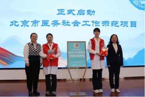 同时,李敏院长还参与了北京市医务社会工作示范项目——《医务社工介入接诉即办实践探索及机制研究》的启动仪式,与杨晨副主任共同揭开项目主题LOGO,现场氛围庄重而热烈。此项目是卫生健康系统在基层治理创新道路上的重要探索。项目将充分借助学院在医务社会工作领域的学术积淀,系统梳理并优化“接诉即办”工作流程,搭建一套科学的效能评估体系,助力提升基层医疗治理水平,推动医务社会工作服务的规范化、专业化。活动当日正值世界社工日,借此契机,李敏院长与杨晨副主任向丰台中西医结合医院的两位优秀医务社会工作者赠送了专业书籍,为她们持续提升专业能力提供有力支持,同时激励广大医务社会工作者投身到基层医疗服务创新实践中去。