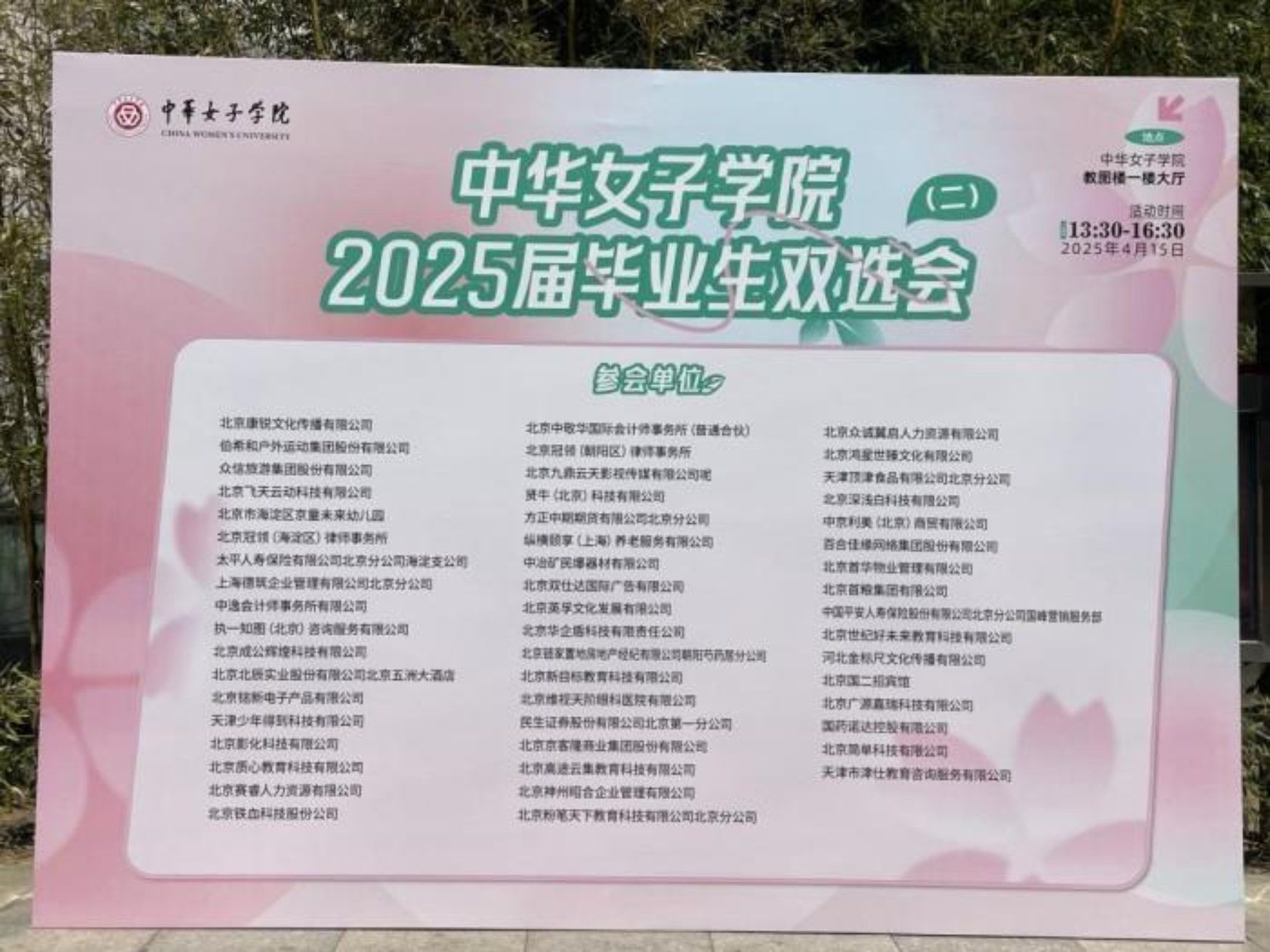 4月15日,由中华女子学院与北京高校大学生就业创业指导中心联合举办的“京彩就业”2025届毕业生双选会(二),在教图楼一层大厅顺利举行。作为春季促就业系列活动的延展,此次双选会吸引了互联网、文化创意、社会服务等新兴领域超