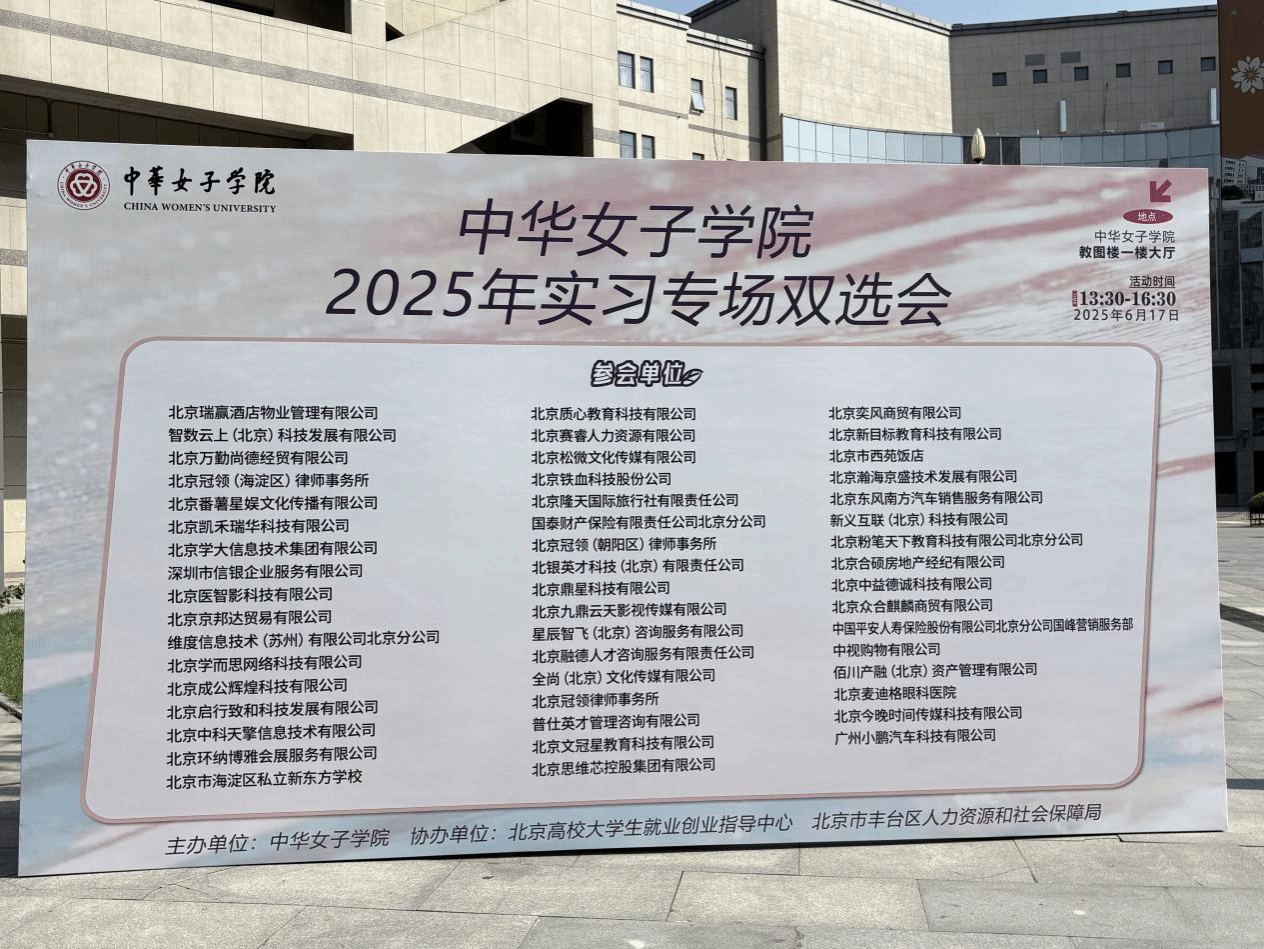 6月17日,由中华女子学院、北京高校大学生就业创业指导中心、北京市丰台区人力资源和社会保障局联合主办的 “京彩就业” 2025 年实习专场双选会,在中华女子学院教图楼一楼大厅成功举办。这场双选会,以实习岗位为主,全力护航莘莘学子迈出职业生涯的第一步。