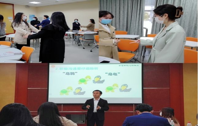 在10月18日的讲座中,苏老师从心理学原理出发,引导同学们回忆生活中的点滴感受,让同学们对自己最近的心理状态有了初步的觉察。课中,苏老师以一个简单的问题“如何分橘子”,引导同学们打开心门,抛出此次讲座的核心观点——积极沟通。同学们通过“乌鸦和乌龟”等益智游戏,懂得了积极有效沟通的三个因素包括结合情境、仔细聆听、准确表达。