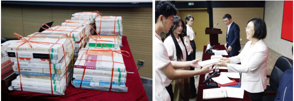 书香润心、知识赋能。典礼中特别设置了“哲思润新·文史伴行:首书借阅”的特殊环节。为助力同学们开启学术探索之旅,学校图书馆精心为每位新同学准备了首本借阅书籍。新生代表从校领导和图书馆馆长、教务部部长手中接过的首本借阅书,寄托了老师们的殷切期望,希望同学们多读书,读好书,广博学识,涵养心性,在书海中汲取智慧与力量。