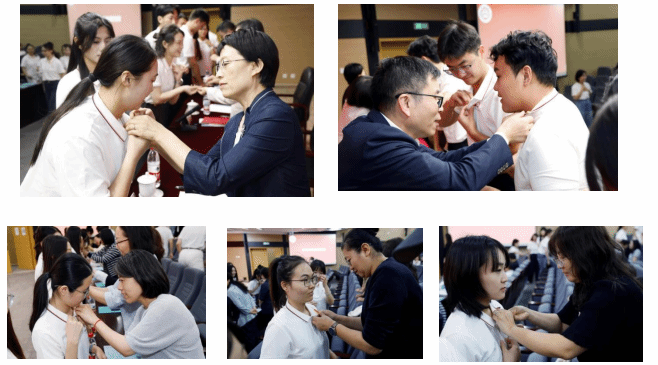 在悠扬的校歌声中,迎来最为激动人心的环节到来——为新生佩戴校徽。校领导与老师们为新生代表逐一佩戴上熠熠生辉的校徽。校徽不仅是学子身份的象征,更承载着学校的传统、精神和期望,寓意着荣誉与责任并重。戴上校徽,象征着同学们与学校血脉相连,共同奋进。