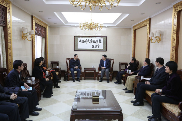 2016年3月14日下午,学校党委书记李明舜、院长刘利群、副院长王练带领学校办公室、质量监控处等职能部门及院系教学单位相关人员一行18人,赴外交学院调研本科教学审核评估与“十三五”发展规划编制工作。外交学院院长秦亚青、党委书记袁南生热情会见了我校人员。座谈会由外交学院副院长江瑞平主持。院长助理、教务处处长高飞,学院办公室、人事处、教务处及国际法系、国际经济学院负责人参加了座谈交流。