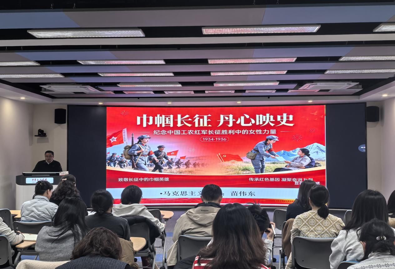活动伊始,马克思主义学院直属党支部副书记、马克思主义学院副院长苗伟东老师以《巾帼长征 丹心映史——纪念中国工农红军长征胜利中的女性力量》为主题,为全体党员讲授了一堂生动而深刻的专题党课。苗老师通过详实史料和感人事迹,深情讲述了女红军战士在长征中克服难以想象的艰难险阻,为中国革命胜利作出卓越贡献和巨大牺牲的英勇故事。她们坚定的理想信念、顽强的革命意志、无私的奉献精神,感动了在场的每一位党员。