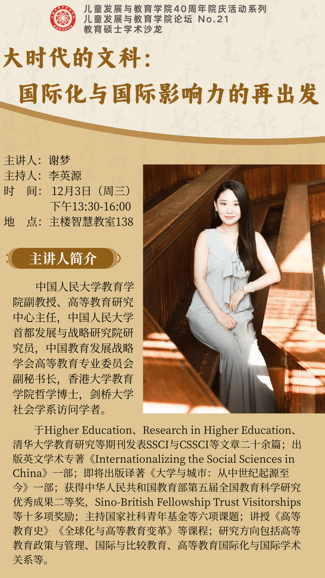 讲座通知:儿童发展与教育论坛第21期——大时代的文科:国际化与国际影响力的再出发