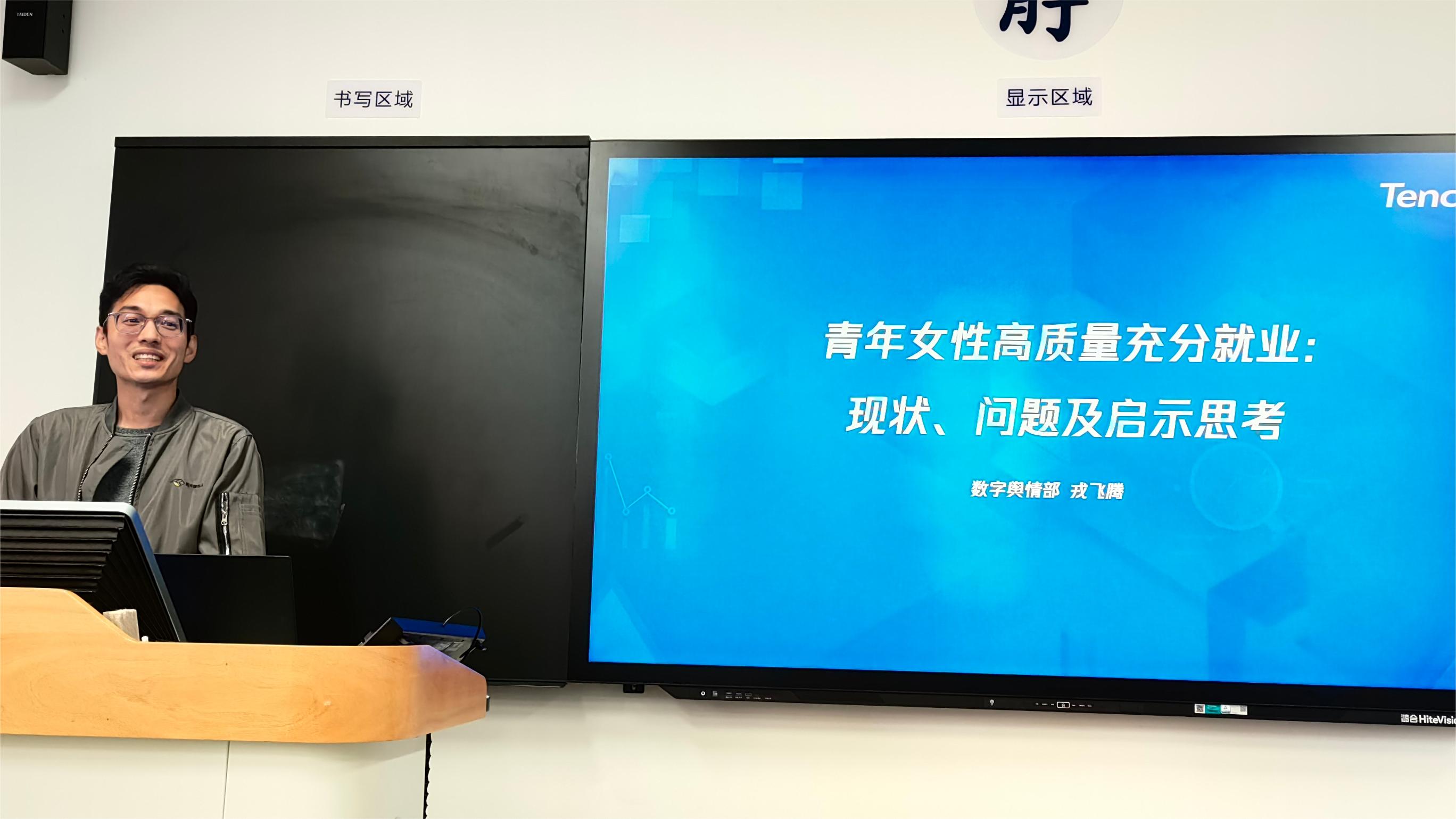 社会和科技的快速发展推动对新人群、新空间、新场景、新领域的社会科学研究,构成新文科和交叉学科的发展生态。为促进教师进一步在数据社会科学领域推进性别研究,妇女发展学院邀请腾讯数字舆情部戎飞腾总监及其同事以“青年女性高质量充分就业”为题介绍了如何通过舆情数据进行性别研究。
